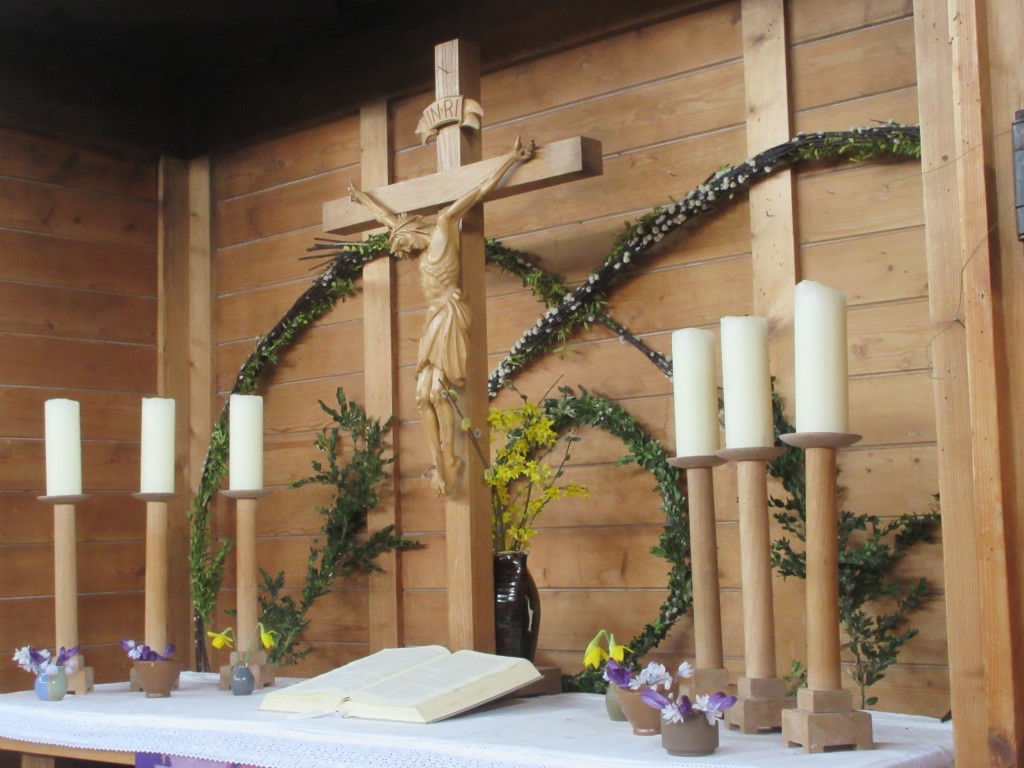 einer eindrucksvollem Installation mit Schriftbildern vor dem Altar, mit